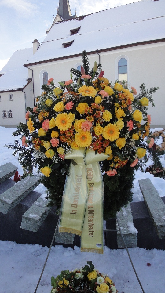 Je nach Wunsch ist es möglich, eine Trauerschleife beim Blumengruss zu integrieren.
